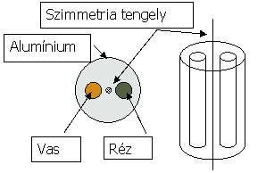 1. ábra: A tesztelésre használt minta: alumínium hengerben elhelyezett vas- és réz-rudak (balra). A PGAI-NT berendezés vázlatos elrendezése (jobbra).
