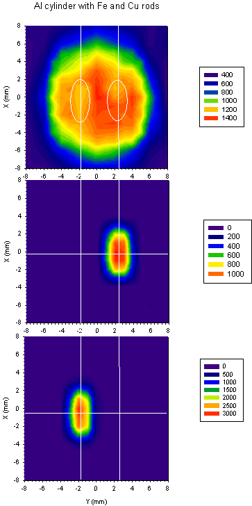 2. ábra: A felső részen az alumínium henger, a középsőn a vasrúd, míg az alsón a rézrúd elemtérképe látható. A színkódok a mérés során detektált, karakterisztikus gamma-sugárzás beütésszámát mutatják a hely függvényében. A fehér vonalak segítik képek egymásra vetítését ill. helyzetük meghatározását.