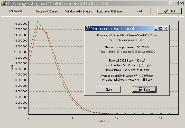 A Neutron program önállóan is használható, de a számítás közvetlenül az adatgyűjtő szoftverből is indítható.- Rossi-alfa eloszlás és a kihalási idő kiszámítása