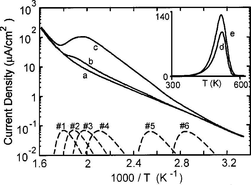 FIG. 1. TSC measurements performed with heating rate β=0.15 K/s and Vbias=5100 V. The background current (a) is measured without excitation. The other curves in the main plot correspond to measurements perfomed after a 30 min excitation using the Xe lamp, before (c) and after (b) NI. The contributions of fit components Nos. 1–6, calculated with arbitrary amplitudes, are shown in the bottom (dashed lines) for comparison. The spectra in the inset have been measured after a priming with a Co60 γ-source, up to a dose of 8 Gy; the signal measured after NI (d) is multiplied by ten for better comparison with the spectrum measured before NI (e).