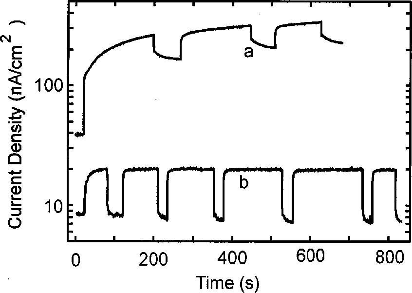 FIG. 4. Current response of the CVD diamond during room temperature exposure to a Co60 γ-source measured (a) before (as grown) and (b) after NI. The source has been switched on and off several times to test the dynamic response of the sample. The applied voltage is 100 V, the dose rate is 0.3 Gy/min.