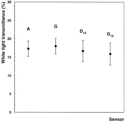 and the ratio is taken as the transmittance of the sensors to the integrated white-light
