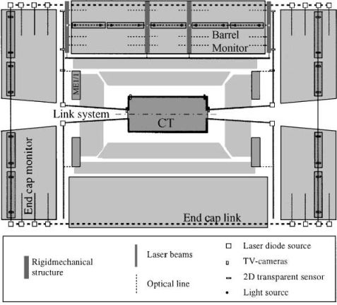 Fig.1.Longitudinal view of the CMS detector, showing the different alignment systems and the position of the 2D sensors.