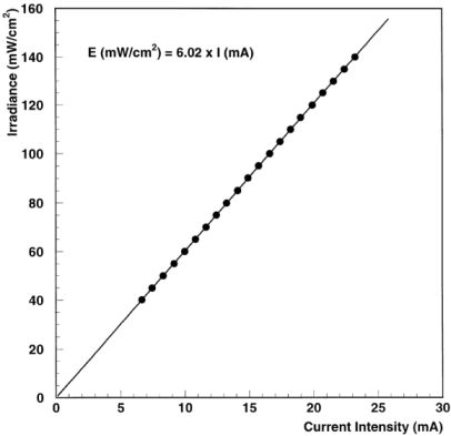 E(mW/cm2) = (6.02±0.01)×I(mA)+(-0.03±0.08).