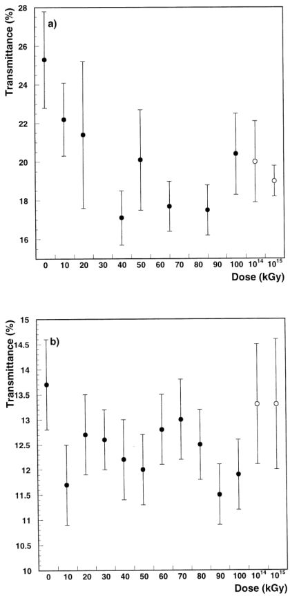 Fig. 8. Transmittance as a function of absorbed dose (see text): (a) Schottky sensor, (b) p-i-n sensor.